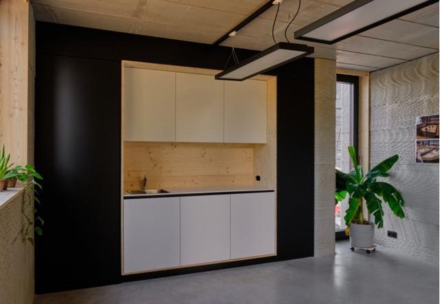 原型房屋的内部尺寸类似于典型的比利时房屋,但它是为政府资助的研究目的而创建的,强调了3D打印建筑物的潜力,因此没有人真正不住。有一个门厅,2间会议室和一个厨房区。 Kamp C还增加了一些可持续的,节能的附加功能,例如地板采暖,太阳能电池板和热泵。未来还将计划建造环保屋顶。